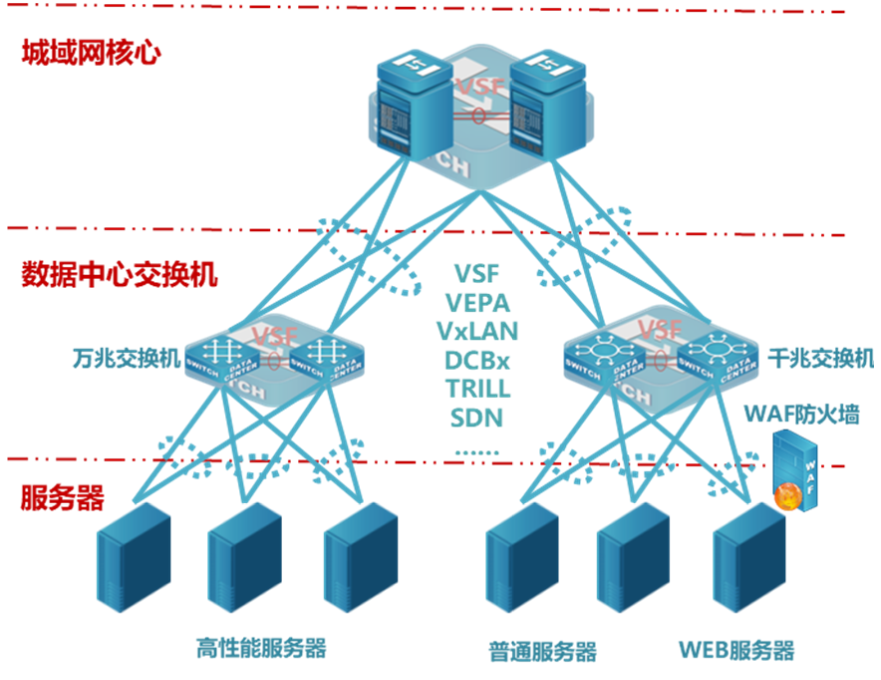 数据中心是整个教育城域网中最重要的资源系统聚集区域,一方面对于网络性能、可靠性有很高的要求,保障业务应用系统的高效、稳定运行,另一方面需要网络给予云计算方面的特性支持,满足数据中心云计算的网络需求。另外,对于最容易受攻击受破坏的WEB应用服务进行针对性的增强安全防护。